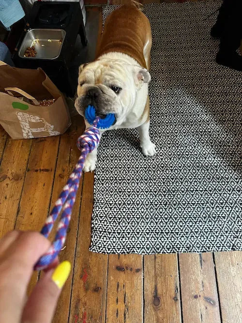 "OMG, this toy is a game changer! My pup is obsessed with it, and it's helped a ton with his anxiety when I'm at work. I luv that it's cleaning his teeth too. It's super durable, and I'm amazed it still looks new after weeks of play. Highly recommend for any dog parent! 🐾"